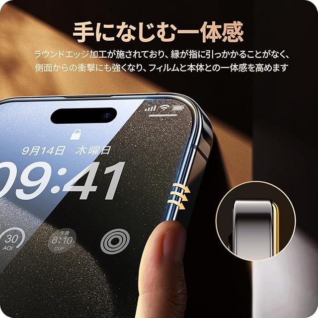 【指紋防止・滑らかな触り心地】従来のガラスフィルムより薄いため、タッチするときも一層スムーズに操作できます。高耐久撥水撥油のAF(Anti-Fingerprint)コーディング加工により、さらに滑らかな触り心地を実現しています。汚れや指紋がついても、拭き取るだけで綺麗になれます。常に美しい画面をお楽しみいただけます。