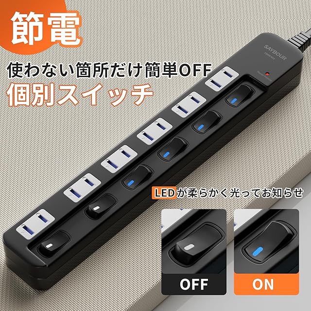 商品名:SAYBOUR 電源タップ 雷ガード 個別スイッチ 節電タップ おしゃれ省エネ ACコンセント 6個口LED PSE認証済 延長コード (1m, ブラック)