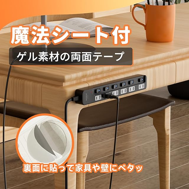 「欲しい場所で機能的に使えるタップ」フックや釘に引っ掛けることができる壁掛けフック穴を背面2箇所に設置。貼ってはがせる超強力粘着両面テープの魔法シートをプレゼントしているので、設置が難しい場所にも簡単に貼り付け可能。180°スイングプラグは狭いところにもスッキリ配線。