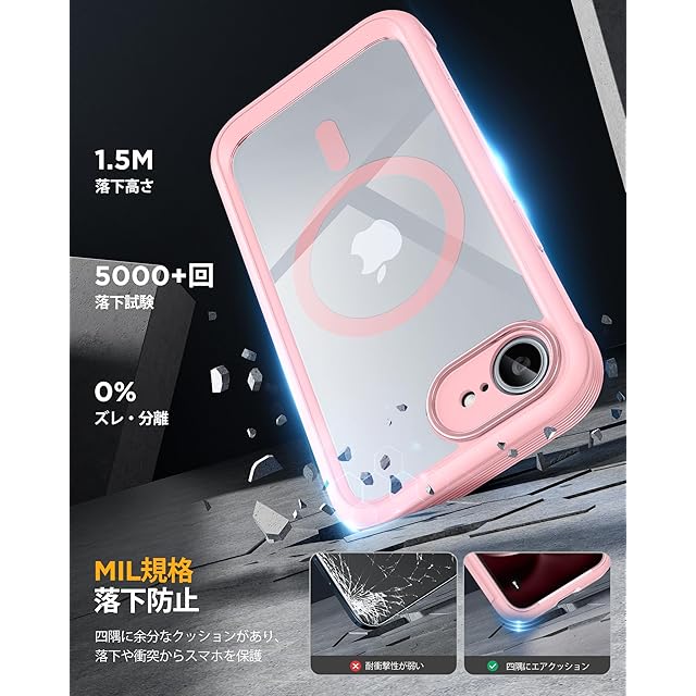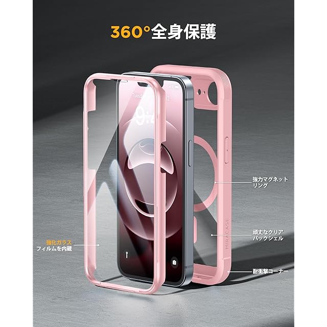 Miracase iPhone 16E ケース MagSafe対応 あいふおん16e スマホケース 2025 9H強化ガラス 6.1インチ フルカバー 360°全身保護 ワイヤレス充電対応 ピンク | TREND DESIGN 家電専門店