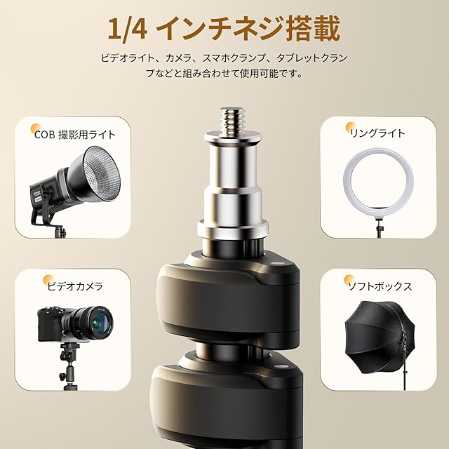 【汎用性のある互換性】照明スタンドの先端に1/4ネジが搭載られて、ソフトボックス、傘、反射鏡、リングフラッシュライト、LEDライト、雲台、デジタルカメラなどに適用。YouTube生放送、写真撮リ、ビデオ撮影などにご利用いただけます。