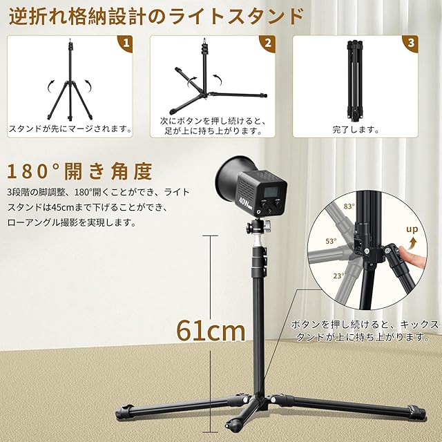 【逆折り畳み収納・軽量】逆折れ格納式デザインなので、普通のライトスタンドと異なり、折り畳後の長さがより短くて、室外で撮影する場合は更に手軽に持ち運べます。重量わずか1.3kgで、コンパクトな56*9*9cmに折りたたまれ、調節可能な照明スタンドは持ち運びが簡単です。