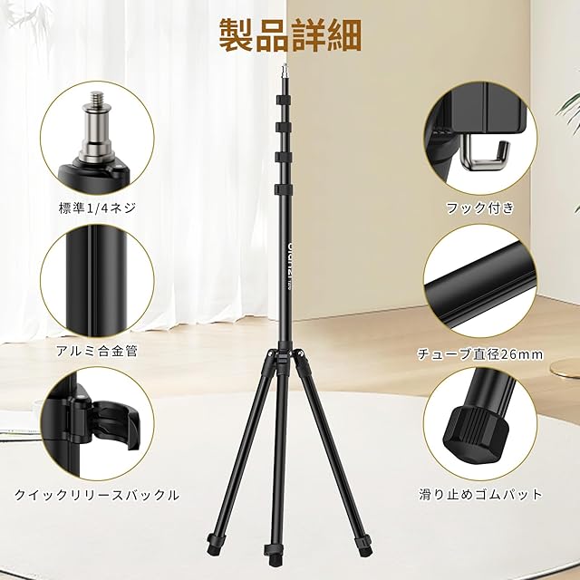 商品名:Ulanzi T270 撮影用 ライトスタンド 2.7m カメラ三脚 撮影用スタンド アルミニウム製 軽量 逆向き折り畳み 55-270cm 5段伸縮 1/4ネジ搭載 持ち運び便利 ストロボスタンド リングライト ビデオライト ソフトボックス cobライト などに対応
