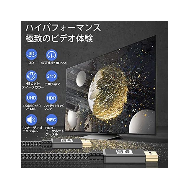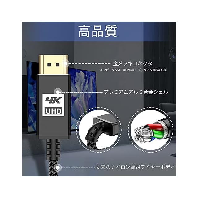 <b>高画質・高音質の安定伝送</b><br> ►スリムな端子なのに高遮蔽性 <br>►コネクタはミニマリズムで、抜き差し心地と配線を両立。<br> ►ノイズ防ぐブリキ防護層・防護線材を内蔵しており<br>►安定した高画質をお楽しんでください。<br> <br>4K/Ultra HD対応のPremium HDMI Cable規格<br> ■4K/60Hz<br> ■HDR<br> ■フルHD・ 3D映像<br> ■HEC(HDMIイーサネットチャンネル)<br> ■ARC(オーディオリターンチャンネル)<br> ■BT.2020、Deep color対応<br> ■18Gbps高速伝送対応 <br><br>映像転送</b><br> 4K 3840×2160 30Hz 60Hz <br>2K 2560×1600 165Hz 144Hz <br>2K 2560×1440 165Hz <br>144Hz 1080p 1920×1080 167Hz