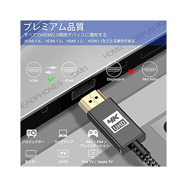 【対応機種】:最新規格HDMI 2.0 ケーブルはApple TV 4K, ブルーレイプレーヤー,Roku Ultra, PS4, PS4 Pro/PS3, Wii U, ノートPCなどに適用できます。