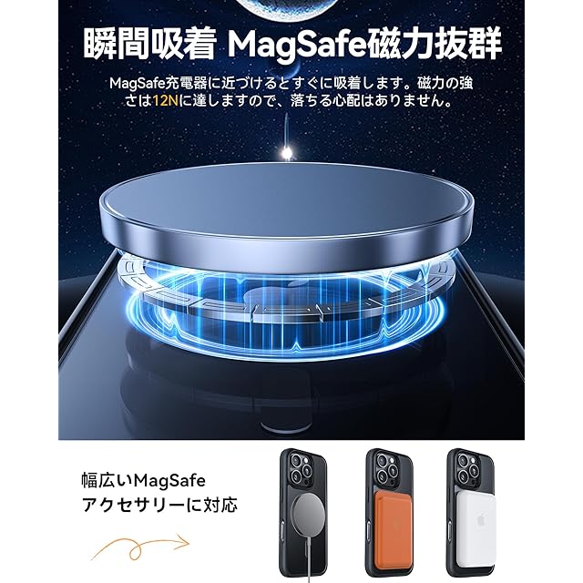【MagSafe対応・強力な磁力吸着】スマホケース内部に38個の強力なN52マグネットを搭載しており、一瞬でピッタリと高速充電を実現!また、ワイヤレス充電やモバイルバッテリー・車載ホルダー・スタンド・リングなど全てのMagSafe対応アクセサリーにもばっちり対応しています。