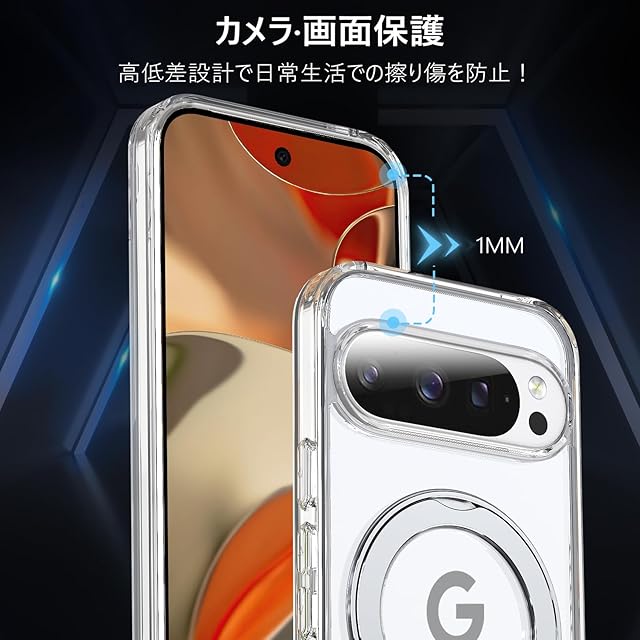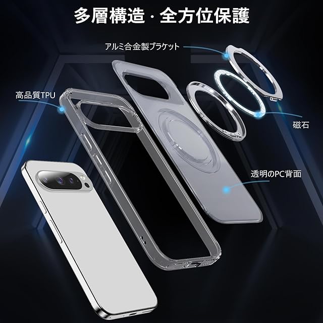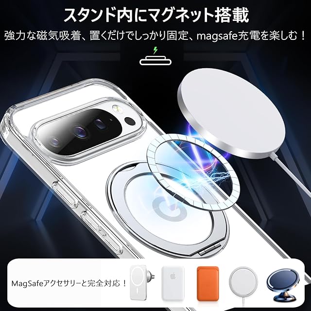 KWATUNG ケース Google Pixel 9/9 Pro 用 ケース magsafe対応 ワイヤレス充電 グルピクセル 9Pro用スマホケース 耐衝撃 360°回転スタンド 縦横両対応 マグセーフリング マグネット搭載 防指紋 米軍MIL規格 Pixel 9 9pro用カバー 透明 クリア
