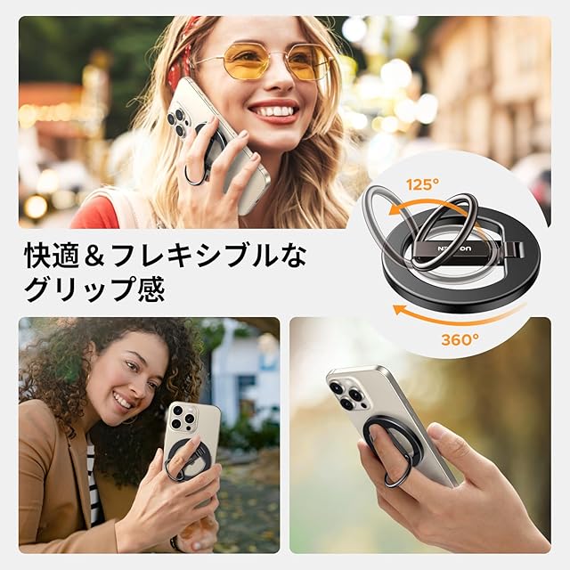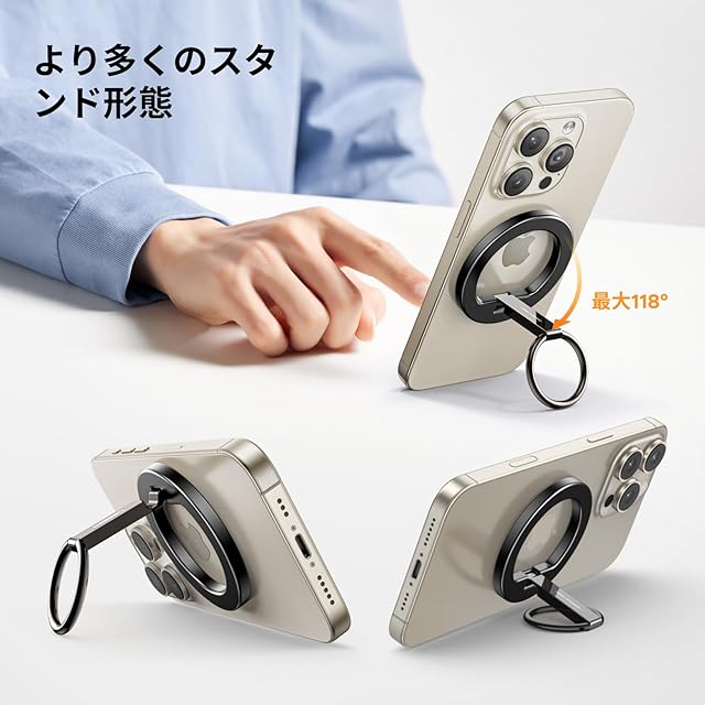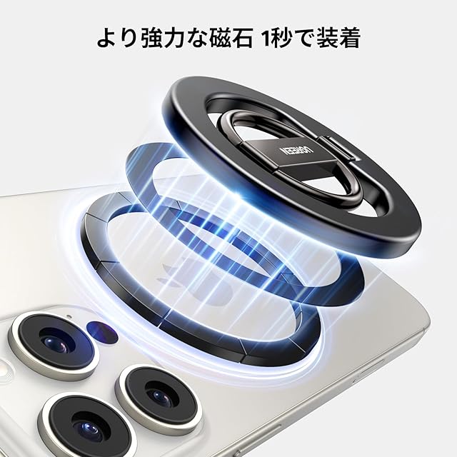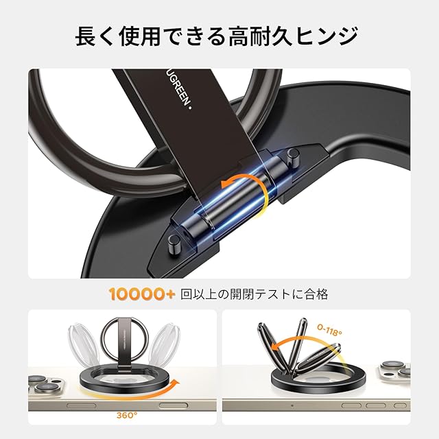 【最新強化型スマホリング】最新強化型UGREEN スマホリングはより強力なマグネットを採用し、約1000gまでの荷重に耐えることができる。強力マグネット内蔵+Magsafeで跡を残さなくて1秒で簡単に装着できる。またスタンドリングは合金製ヒンジで接続して、より頑丈に使用できる。