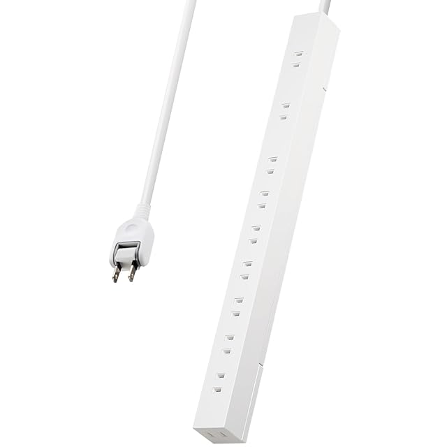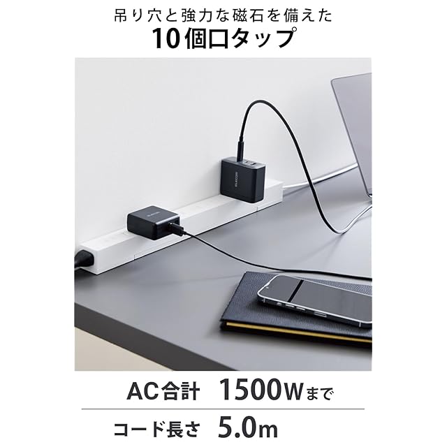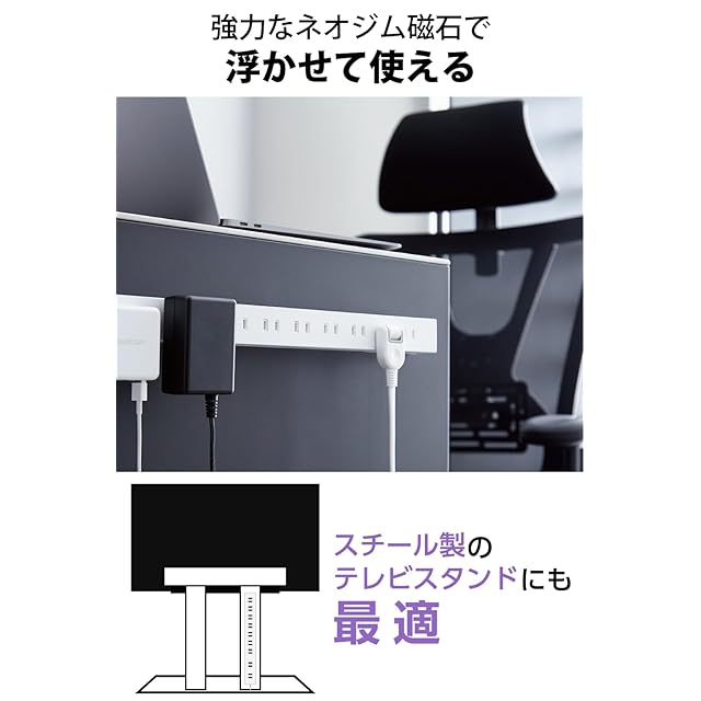 回転収納可能な脚パーツと強力な磁石を特長とする2ピン式のスリムな10個口タップです。脚パーツは展開することで重いACアダプターなどを接続した際もタップが横転しにくくなります。また、強力なネオジム磁石により、スチール製の家具や事務機などにしっかりと吸着できます。