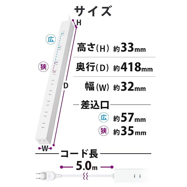 隣の差込口との間隔は57mmが2カ所、35mmが7カ所あり、プラグの形状に合わせて使用できる設計です。間隔が広い差込口には大きなACアダプターなどでも、互いに干渉せずに差し込めます。