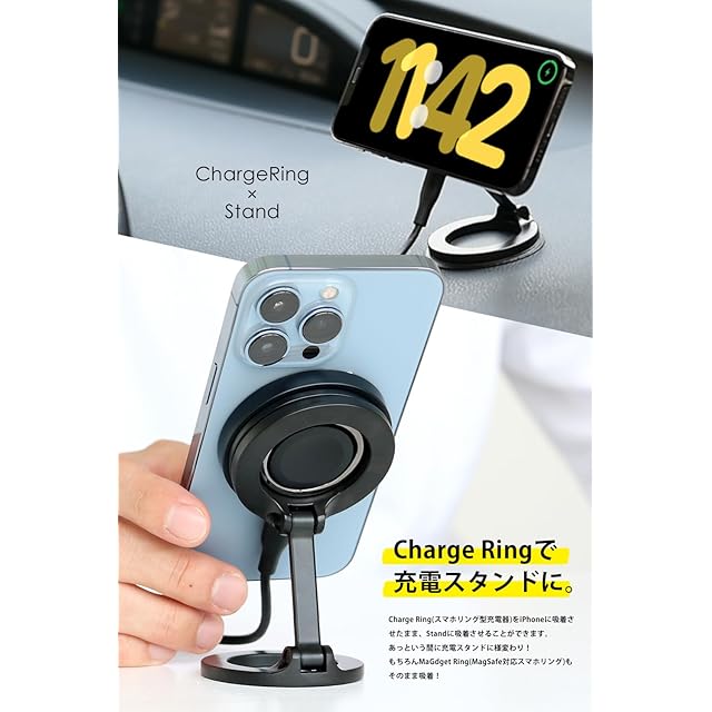 【Charge Ringを吸着したままの使用が可能】チャージリング(別売)と組み合わせて使用すれば、MagSafe充電スタンドに様変わり!マグネットベースの穴にシンデレラフィットするので、スマートに着脱できます。