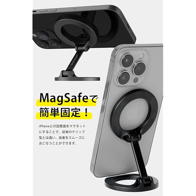 【MagSafeで固定】iPhoneとの設置面をマグネットにすることで、従来のクリップ型とは違い、装着が簡単に。iPhone 12以降のMagSafe対応機種を強力なN52ネオジム磁石でしっかりと固定。縦向き、横向きどちらでも自由自在に設置可能。