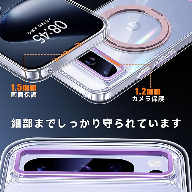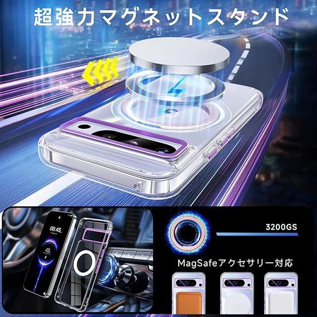 MagSafe対応でワイヤレス充電もスムーズに行え、360°回転リングスタンドで縦横両対応。映画鑑賞やオンライン学習に最適です。MIL規格準拠の高耐衝撃性で、Google Pixel 8 Proをしっかり守ります。高硬度ポリカーボネートとTPU素材を採用し、衝撃や傷から守り、便利なストラップホールで持ち運びも楽々。クリアデザインで黄ばみ防止にも配慮。