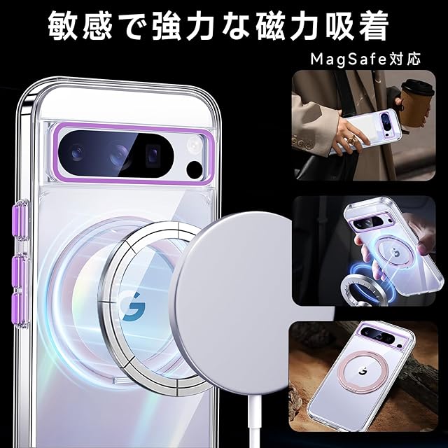 商品名:【米軍MIL規格・Magsafe対応】Google Pixel 8 Pro 用 ケース MagSafe対応 リング360°回転スタンド機能 縦横両対応 半透明 黄ばみ防止 ワイヤレス充電 レンズ保護 耐衝撃 携帯カバー 6.7 インチ マグネット搭載 車載ホルダー マグセーフ対応 おしゃれ(クリアピンク)
