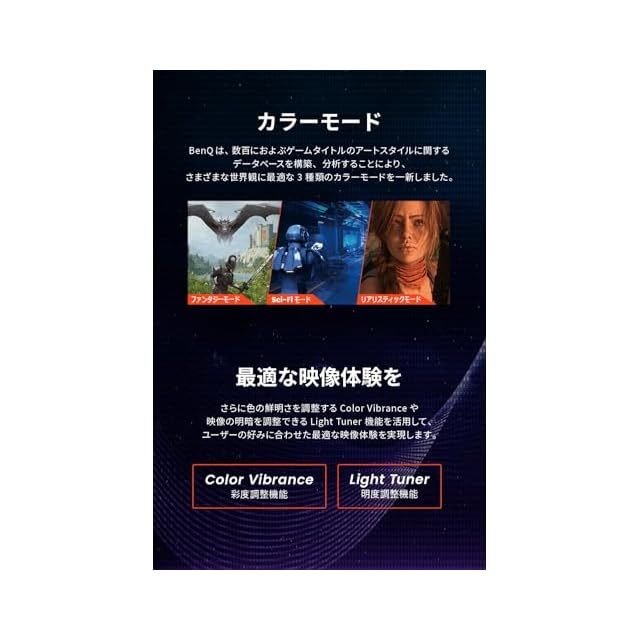 応答速度GtG 1msにより、なめらかな動画視聴やゲームプレイを実現。ゲームのアートスタイルに合わせて新しくなったカラーモード(Sci-Fi, ファンタジー, リアリスティック)を搭載、PS5/PS4/Xboxの世界観を楽しめるゲーミングモニター
