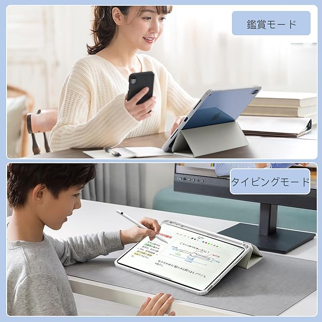 【三つ折り・スタンド機能】カバーは折りたたみ仕様でデザインされており、折りたたんでスタンドになり、二つの角度に調整可能です。これにより、動画視聴やタイピング、ゲームなどを快適にお楽しみいただけます。