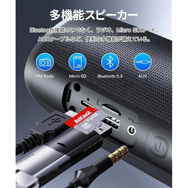 【便利な多機能&Type C充電式】ブルートゥース スピーカーはBluetooth接続のみでなく、ラジオとしても使えます。また、TF/Micro SDカードを挿入し、直接に音楽再生できます。付属のAUXケーブルを接続して有線スピーカーとして使用できます。内蔵マイクでハンズフリー通話にも対応します。スピーカーはType C充電式で、モバイルバッテリーやパソコンなどのUSBデバイスで簡単に充電できます。