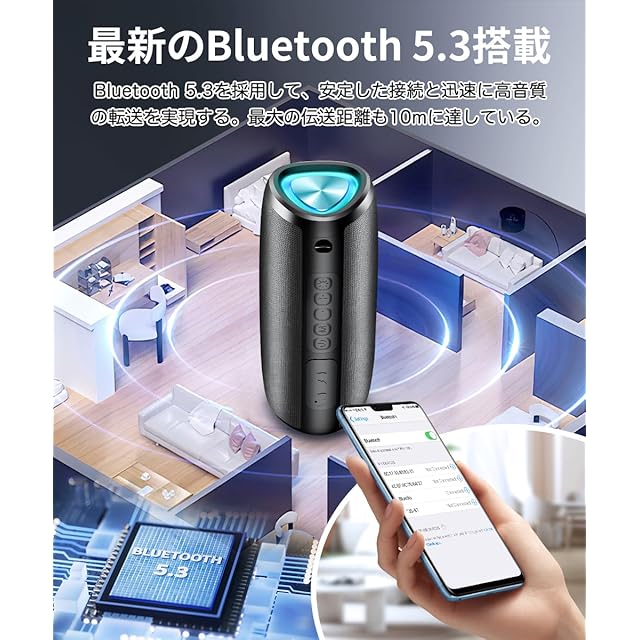 【TWS機能対応&Bluetooth 5.3接続】ワイヤレススピーカーはTWS機能が搭載され、2つのスピーカーを同時にペアリングすれば、家でも映画館のような、臨場感溢れるステレオサウンドが体験できます。また、スピーカーは最新のBluetooth 5.3接続技術を利用して、安定した接続と迅速に高音質の伝送を実現します。最大の伝送距離も10mに達しています。スピーカーは幅広い交換性があり、パソコン、スマートフォン、iPad、テレビなど、すべてのBluetoothデバイスに簡単に接続できます。