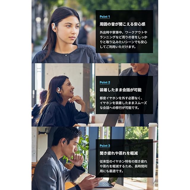 耳を塞がないというイヤホン体験の新常識:周囲の音が常に聞こえるため、家事やランニング、会話をしながらでも安心して利用可能です。またイヤホン特有の聞き疲れや蒸れを軽減することで快適な装着感を提供します。