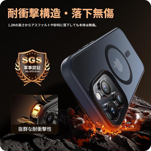 【米軍規格SGS認証・超強耐衝撃性】世界で有名な米国防総省が規定する米軍採用品規格「MIL-STD-810H」認証を取得済みです(認証番号:GZMR220802496801)。コンクリートの地面に厚さ5mmの合板を敷き、高さ1.2mから合計26回、違う角度から落下させる実験をしましたが、本体に傷はつきませんでした。スマホを全方位からしっかりと守ります。