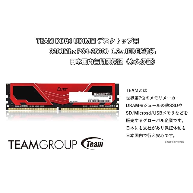 Team デスクトップ用DDR4 3200Mhz PC4-25600 。デスクトップPCの増設用などに。TEAMとは世界第7位のメモリメーカーです。DRAM等を世界各国へ販売しています。DRAMのほかに、SDカードやmicroSDカード、USBメモリもなども取り扱っている世界的なメーカーです。日本国内に支社もあり体制も日本で行えて安心です。