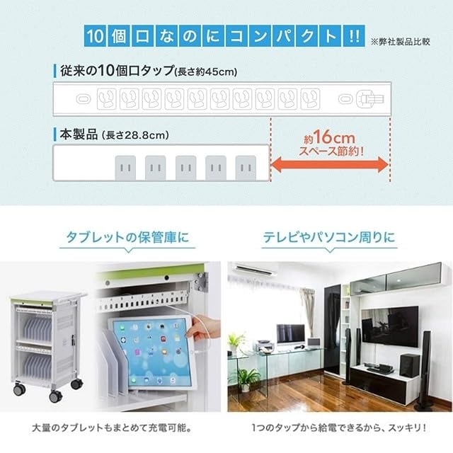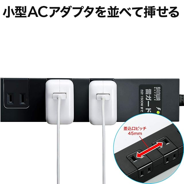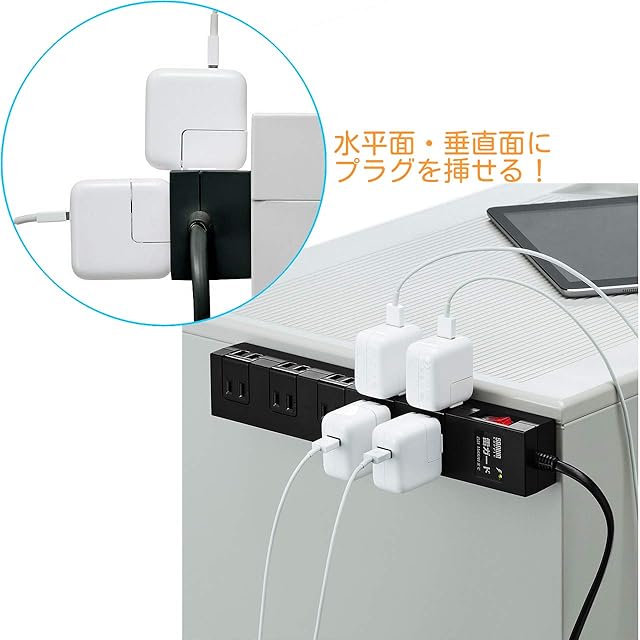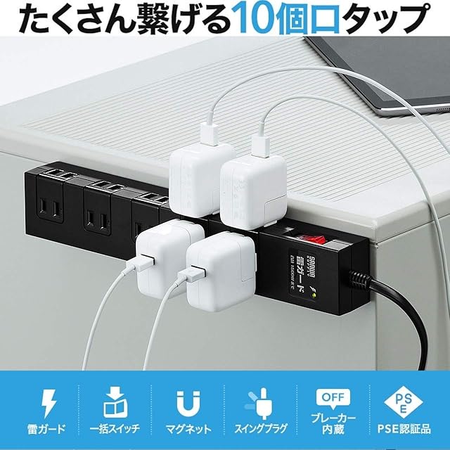 小型ACアダプタが差し込める10個口マグネット付きタップ。 雷ガード、一括集中スイッチ&ブレーカー付き。