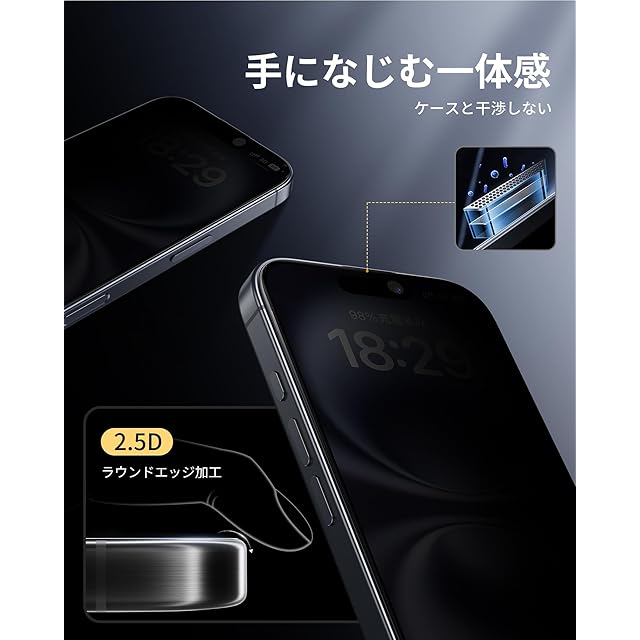 「全面保護・防塵ネット付き」:黒縁取りでアイホン16プラスの画面をフルカバーしており、落下や衝撃による損傷から守ります。2.5Dラウンドエッジ加工が施されており、縁が指に引っかかることがなく、ケースと干渉せずに使えます。スピーカー部分は防塵ネット設計となっており、音質に影響は与えず、微細なホコリや異物の侵入を効果的に防ぎます。