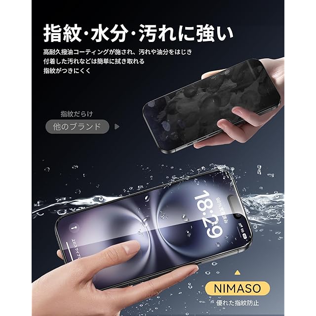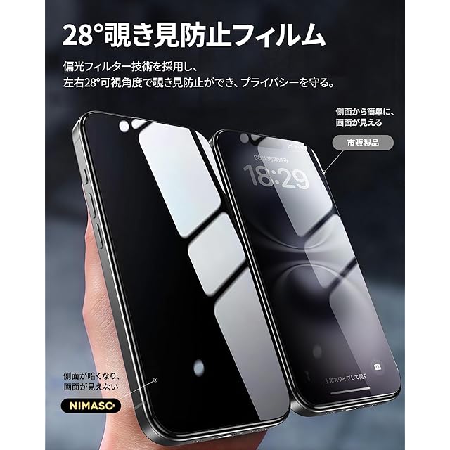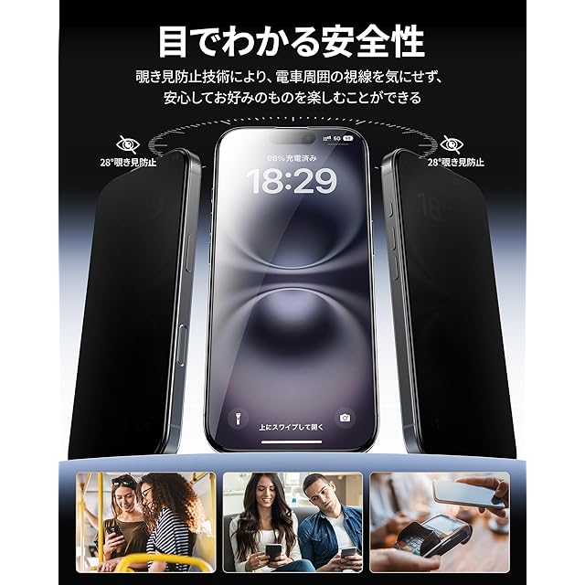「28°覗き見防止」:特別なブラインド加工により、いPhone16 Plusを28°以上傾けると画面が見えないため、左右からの覗き見を防止できます。ビジネスや個人における大切なプライバシーをしっかり守ります。正面からはクリアで高画質な視界を保つことができ、Face IDの認証にも問題ありません。公共の場でも仕事やエンターテインメントなどの活動を制限せずにアイフォンをお楽しみいただけます。