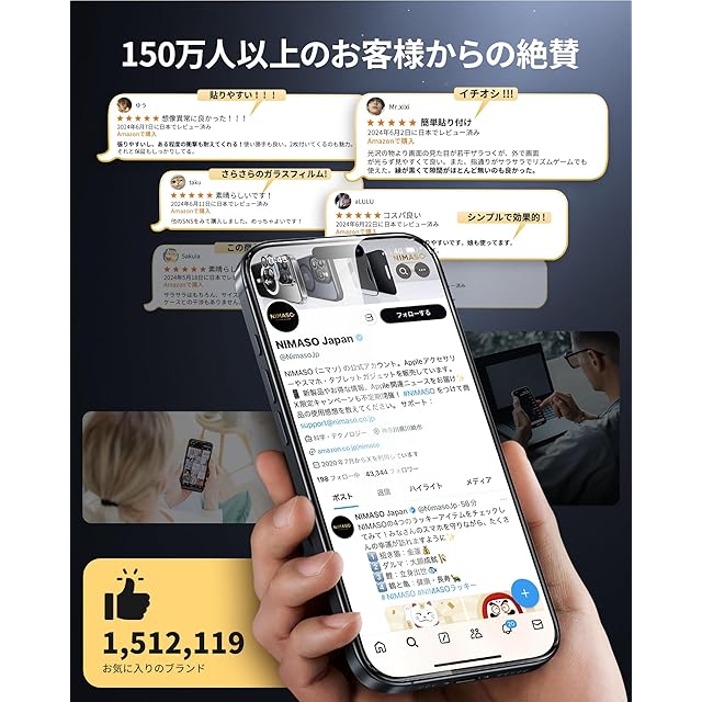 「耐衝撃性アップ・飛散防止」:米軍規格「MIL-STD-810H」認証番号:SZXEC23002005001。9H表面硬度ガラスを採用しており、外部からの衝撃を吸収し、画面へのダメージを可能な限り抑えます。鍵などの鋭利なものとぶつかっても擦り傷がつかず、社内の10,000回の耐摩耗性テストをクリア済。また、飛散防止デザインにより、万が一割れても飛散する心配がなく安心に使えます。
