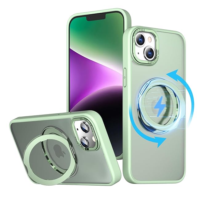 KWATUNG 互換品 ケース iphone14 用 ケース magsafe対応 ワイヤレス充電 いphone14 用ケース 耐衝撃 iphone13 用ケース magsafe対応 360°回転スタンド 縦横両対応 アイフォン14 用ケース マグネット搭載 アイフォン13用ケース 米軍MIL規格 スマホケース iphone 13 用 iphone 14 用 6.1インチ マット感 ライトグリーン