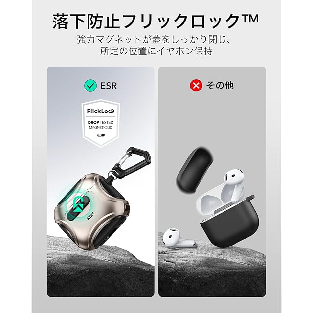 【安全なフリックロック】:フタの上部と底部に700gの保持力を持つ強力なマグネットと内部のラッチにより、AirPodsを中に安全にロックし、落としても飛び出すことはありません。