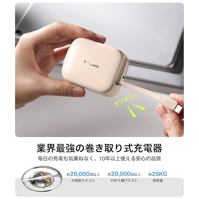 【業界最強巻き取り式】巻き取りケーブルは20000回の折り曲げ試験に合格した高耐久モデルです。業界最強の巻き取り式充電器なので、10年間使用できる長寿命です。また、わずか0.68mの長さで、どこへ行っても持ち運びしやすく、バッグに入れても場所を取らないため、収納の心配は不要です。長い充電ケーブルがバッグの中で邪魔になることもなく、出張や旅行もスムーズに!