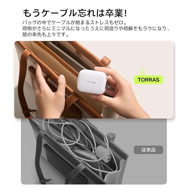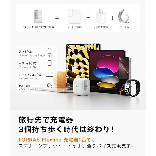 【さよなら、充電ケーブル】 TORRAS FlexLine 充電器は2023年の発売以来、ついに世界で累計販売台数100万個を達成しました。TORRAS FlexLine は「いつでもどこでも、安心·安全」をめざしして、性能だけではなく、TORRASならでは品質とデザインの強みで、ミニマリズムを極めた充電器はお届けしていきます。「巻き取り式充電ケーブル」がこんなに便利だとは…! 充電器類かさばる問題、小さなコレで解決できました。充電での失敗もう、起こりません」。ガジェット好きなら、「荷物は減らしたいけど、充電性能は妥協したくない!」そんなあなたのための一台です。