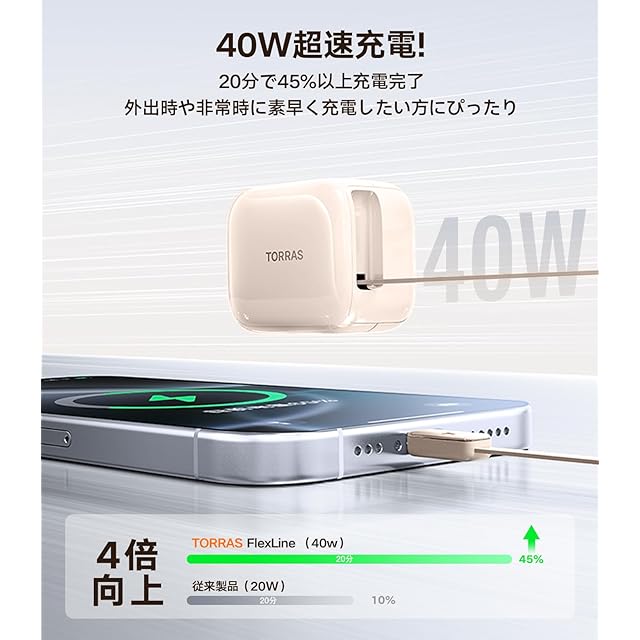 商品名:【2025最強版 】TORRAS FlexLine 40W 充電器 type-c 急速充電器【巻き取り&無階段調節】タイプcリール付き 2台同時充電 PD3.0対応 折りたたみ式プラグ 超コンパクト 持ち運び便利 GaNIII技術 iPhone16/15/ iPad等対応 旅行/出張/自宅/デスク周り PSE技術基準適合