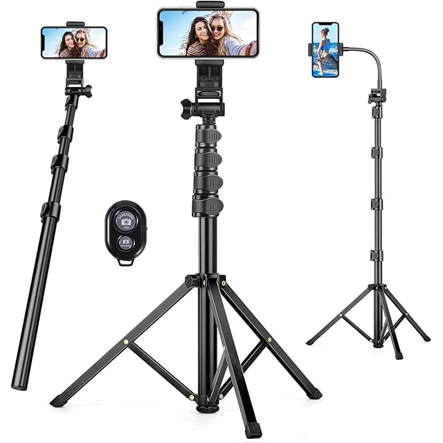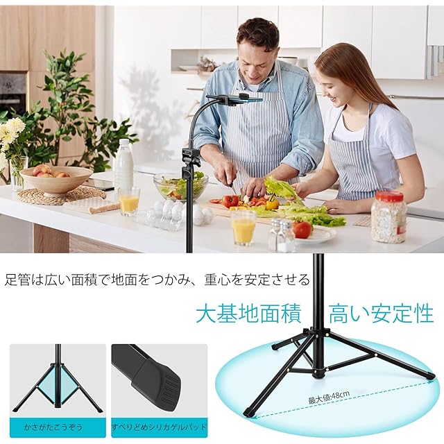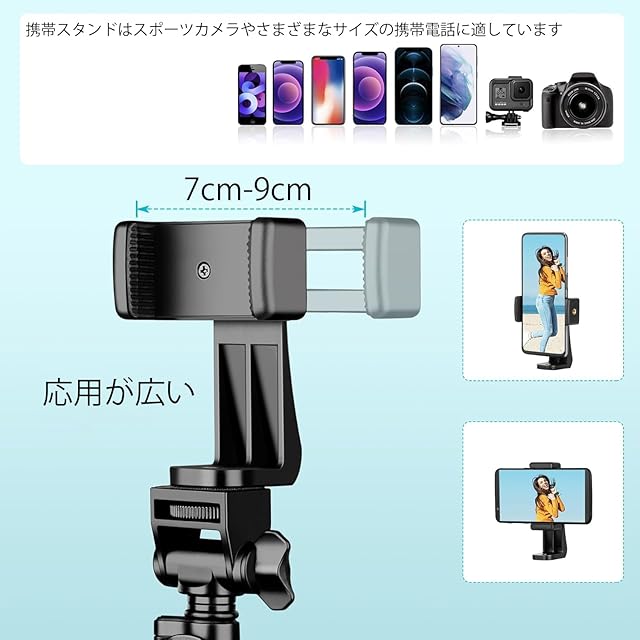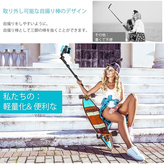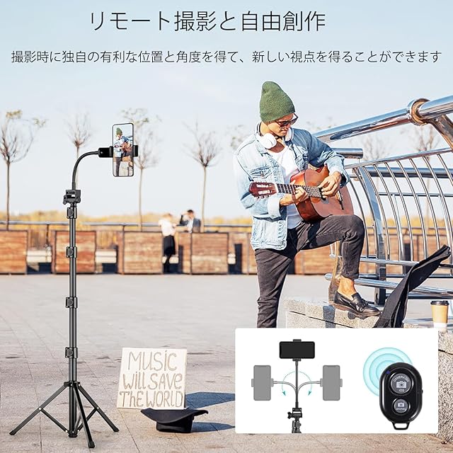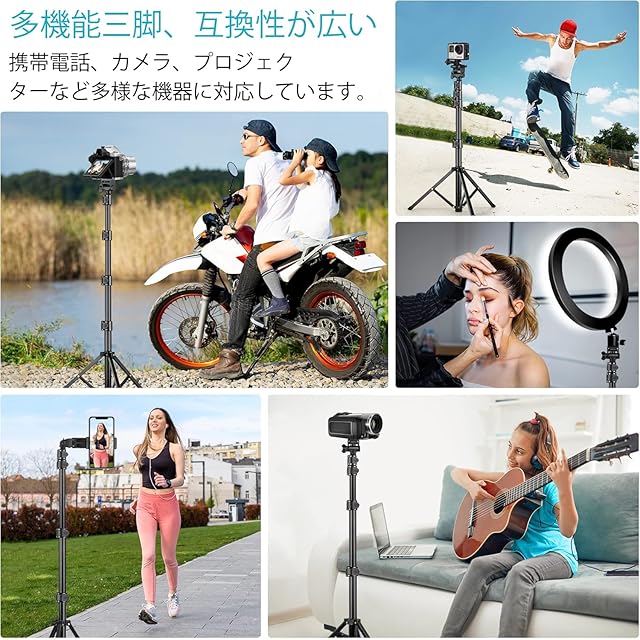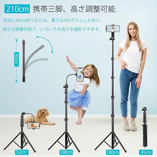 商品名:スマホ 三脚 最大高210cm,2 in 1 自撮り棒三脚 450g軽量 アルミニウム合金4段階伸縮 360角度調節 電話ホルダー付きスタンド すべてのスマホ機種対応 iPhoneシリーズ/Androidシリーズ