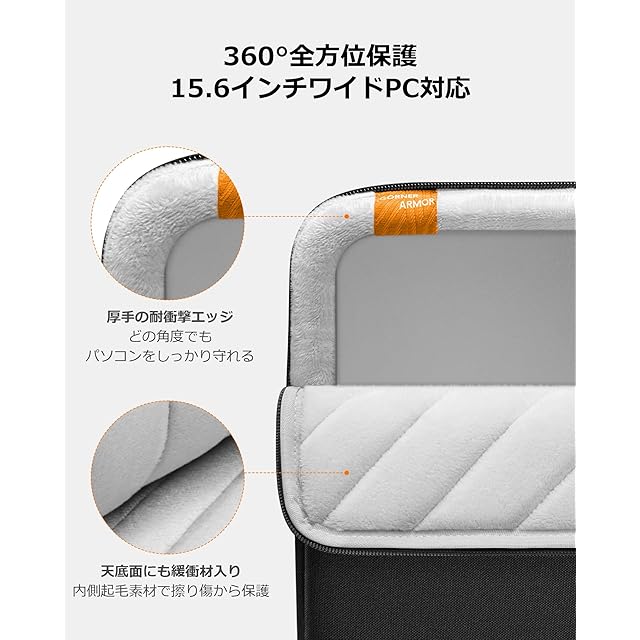 tomtoc Defenderシリーズ 360度保護パソコンケース</br> 【軍用レベルのCornerArmor保護】</br> ケース全ての4隅に、新世代の特許取得の「CornerArmor」ガードが装備され、軍用レベルの落下テストをクリアした超強耐衝撃力でエアバッグのようにご貴重なノートPCを落下・衝撃などぶつかることから全方面丸ごと守ります。(落下テスト規格:MIL-STD-810H:2019)</br> 【360° 全面保護】</br> 内部は厚くふわふわとしたフランネル起毛生地の採用に加え、tomtocパソコンケースの統一なデザインとして、中はラインが並んでいる模様に設計され、洗練されて整然とした見た目でながら耐衝撃にも役立ちます。ジッパー周りの厚手高弾性エッジにより、ノートPCがジッパーに当てて、傷付くことを防げます。</br> 【品質や環境保護への取組み】</br> 安心のYKK製両開きファスナーを使用し、耐用性に優れて、開閉もよりスムーズで使いやすいです。表地は撥水加工された、PETボトルなどのプラスチックをリサイクルしてから作ったエコ素材を採用。プラスチックの再生利用により環境汚染の減少に取り組んでおります。tomtoc製品は12ヶ月間安心付きます。</br> 【便利な小物ポケット】</br> フロントポケットはKindle、アダプター、ケーブル、バウス、ハブ、USBメモリ、イヤホンなどのPC周辺小物を一気に収納できます。AirTagや鍵掛け用ストラップ付。<p><b>カスタマイズされた保護ケース</b><br/> 15.6型ノートパソコンに対応。<p><b>パッケージ</b><br/> 1xtomtoc 15.6型ノートパソコンスリーブ <br/> 1xパッド<br/> 購入日から、12ヶ月限定日本国内付き<p><b>ノート</b><br/>写真の照明や画像処理の加減により実物の色味と若干異なる場合もございます。あらかじめご了承の上ご購入下さい。