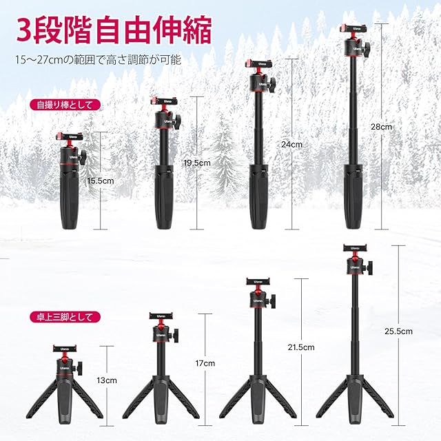 【3段自由伸縮】最短で15cm、最大で27cmの範囲で高さ調節が可能、複数の人が一緒に撮影するときの悩みを解決します。好きな高さで撮影できるようになります。 スマホはしっかりと固定できます。MT50三脚は卓上3脚、自撮り棒、一脚として使用も楽です。