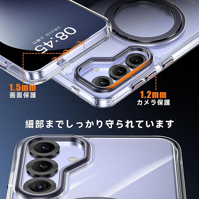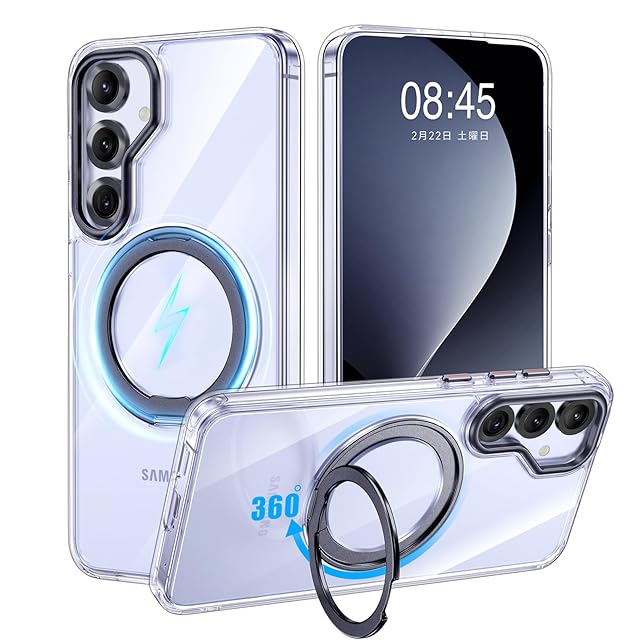 商品名:【米軍MIL規格・Magsafe対応】Galaxy S25 用 ケース MagSafe対応 リング 360°回転スタンド機能 縦横両対応 透明 黄ばみ防止 ワイヤレス充電 レンズ保護 耐衝撃 携帯カバー ギャラクシー S25 カバー マグネット搭載 車載ホルダー マグセーフ対応 おしゃれ (クリアブラック)
