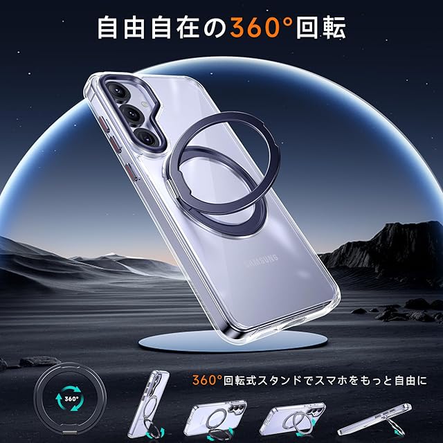 【360°回転スタンド付き】360°回転できるリングスタンドが一体型で、縦向き・横向き両方に対応します。映画鑑賞やオンライン学習、ビジネスシーンに最適で、角度調整が自由自在。使わない時はスタンドを折りたたんで、スッキリ収納できます。