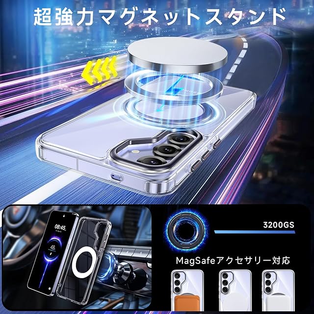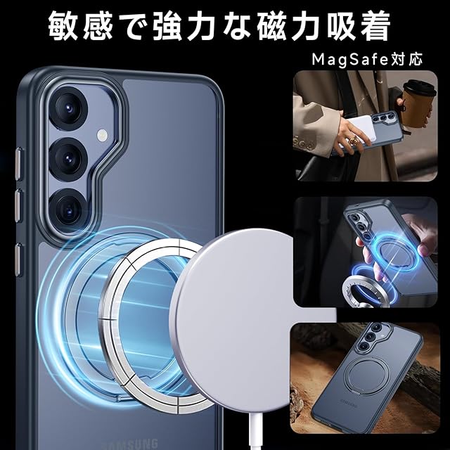 MagSafe対応でワイヤレス充電もスムーズに行え、360°回転リングスタンドで縦横両対応。映画鑑賞やオンライン学習に最適です。MIL規格準拠の高耐衝撃性で、Galaxy S25をしっかり守ります。高硬度ポリカーボネートとTPU素材を採用し、衝撃や傷から守り、便利なストラップホールで持ち運びも楽々。クリアデザインで黄ばみ防止にも配慮。