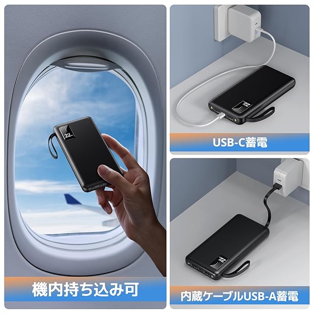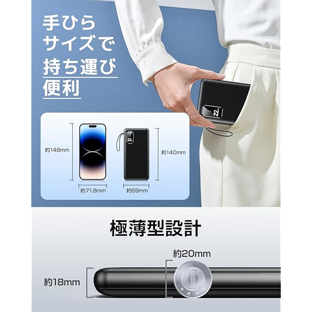✅【軽量&コンパクト・持ち運びに最適】この モバイルバッテリー は超大容量ながら、スリムで軽量なデザインを実現!バッグやポケットにスムーズに収納でき、旅行・出張・通勤・アウトドア・災害時にも大活躍。 ✔ 40%サイズダウン(従来の大容量バッテリーと比較) ✔ 重量:約370g(スマホ約2台分の軽さ)