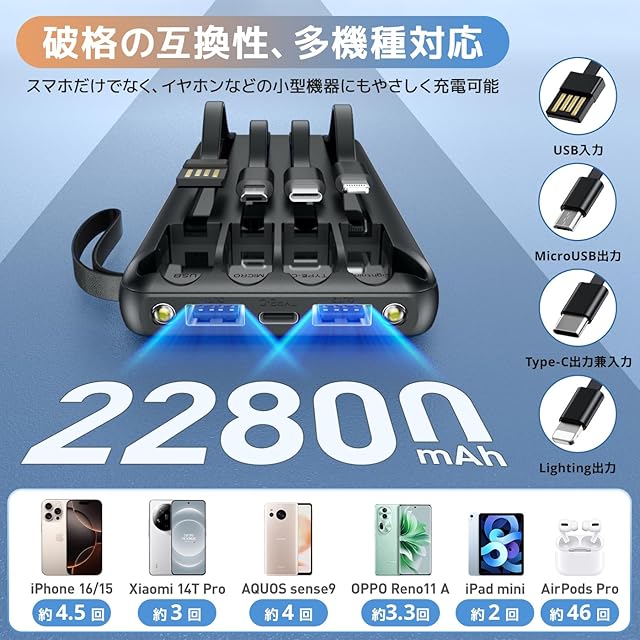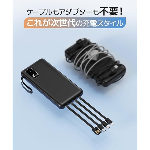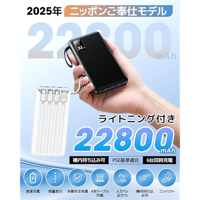 商品名:モバイルバッテリー 大容量 22800mAh 『ケーブル内蔵×4・PSE認証済』 小型 軽量 2.4A 急速充電 6台同時充電 低電流モード ライトニング付き USB-C入力/出力 タイプc iphone モバ充電 薄型 急速充電 type-c コンパクト 機内持ち込み可 ライトニング付き パススルー 多重保護システム ライト付き 防災グッズ 旅行