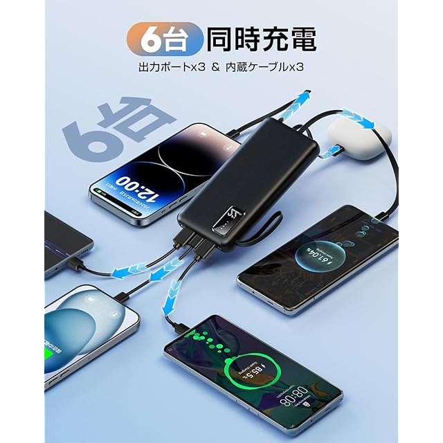 ✅【4本のケーブル内蔵&6台同時充電】 モバイル・バッテリー にUSB-C / Micro USB / Lightning / USB-A の4本のケーブルが本体に内蔵され、追加のケーブルが不要!さらに、USB-Cポート×1、USB-Aポート×1も搭載し、最大6台同時充電が可能。友人や家族とシェアしながら効率よく充電できます。