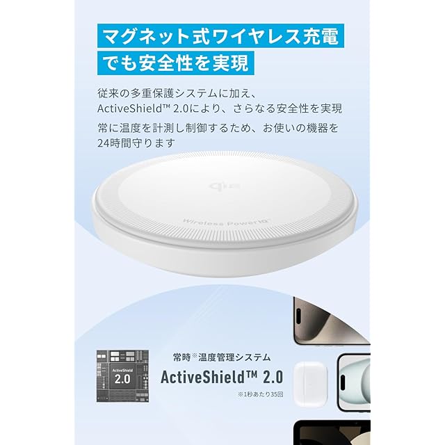 マグネット式ワイヤレス充電でも安全性を実現:従来の多重保護システムに加え、 Active Shield2.0により、さらなる安全性を実現 常に温度を計測し制御するため、お使いの機器を24時間守ります