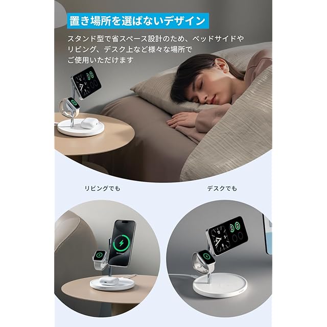 3台まとめてこれ1つ:これ1台で、Qi2対応スマートフォンやワイヤレスイヤホン、Apple Watchの3台を同時に充電可能です。