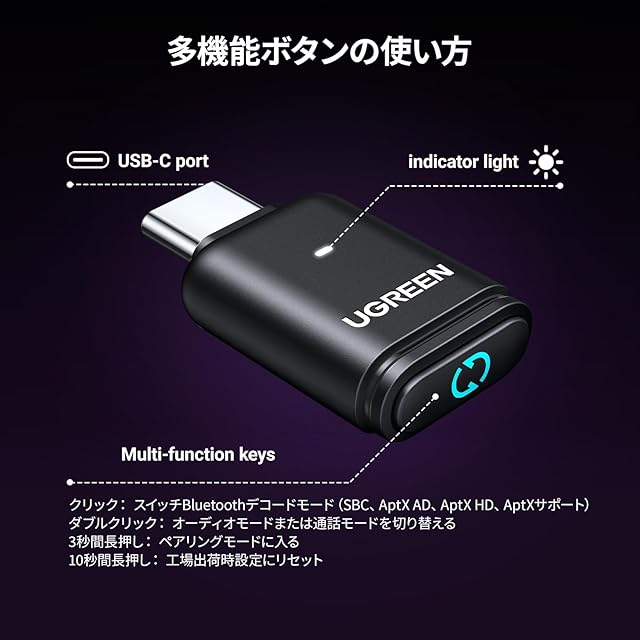 UGREEN PS5用USB-C Bluetoothアダプタ APTX 低遅延&aptX適応のBluetooth 5.3オーディオアダプタ、ワイヤレスヘッドホン&イヤホンを接続でき ワイヤレスオーディオトランスミッター