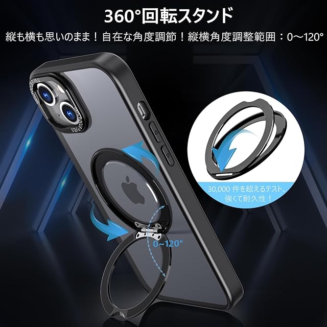 【360°回転スタンド · 縦も横も思いのまま】多機能スタンドとリング一体型の斬新なデザインです。ケースを閉じれば背面はスマートに平坦に。縦置きでも横置きでも安定して支えられ、0°~ 120°の間で多角度自由に調整できます。ケースを開けるだけでスタンドの完成!指にかければリングも便利に使用でき!また、安定したアルミ合金製の円形スタンドを採用しており、携帯性からもファッション性からも唯一無二の存在です。