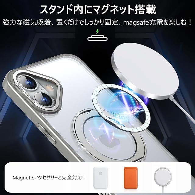 商品名:KWATUNG ケース iphone 16 plus 用 ケース magsafe対応 ワイヤレス充電 iphone16plus 用ケース 耐衝撃 落下防止 いphone16plus 用ケース 360°回転スタンド 縦横両対応 アイホン16プラス用ケース マグネット搭載 アイホン16plus用ケース 防指紋 米軍MIL規格 6.7インチ 半透明 マット感 チタングレー