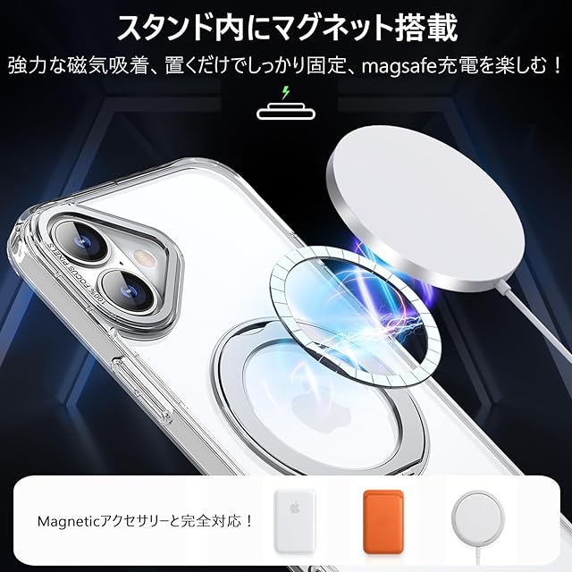商品名:KWATUNG ケース iphone 16 plus 用 ケース magsafe対応 ワイヤレス充電 iphone16plus 用ケース 耐衝撃 落下防止 いphone16plus 用ケース 360°回転スタンド 縦横両対応 アイホン16プラス用ケース マグネット搭載 アイホン16plus用ケース 防指紋 米軍MIL規格 6.7インチ 透明 クリア