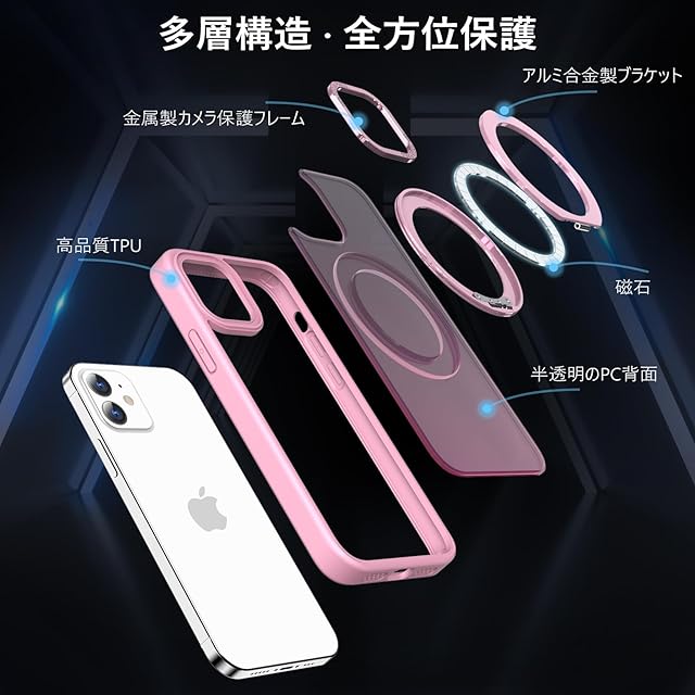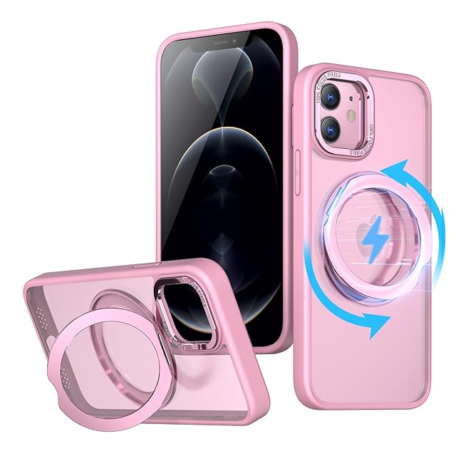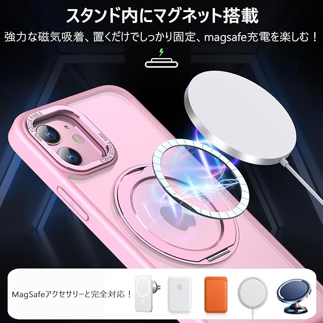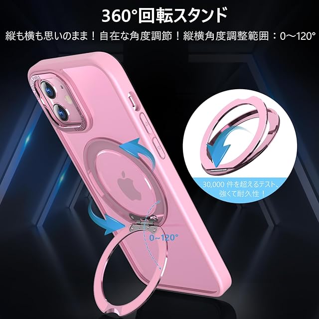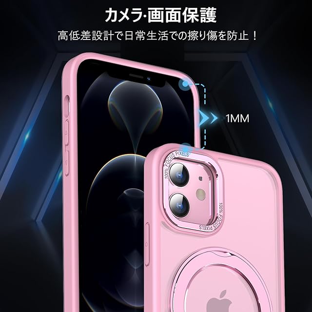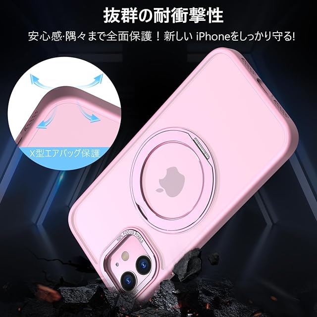 KWATUNG iPhone12 用 ケース iPhone 12 Pro 用 ケース magsafe対応 ワイヤレス充電 耐衝撃 いphone12 用ケース 360°回転スタンド 縦横両対応 アイフォン12用ケース マグネット搭載 アイフォン12pro 用ケース 防指紋 米軍MIL規格 スマホケース iphone12/iPhone12 Pro 用 6.1インチ 半透明 マット感 ピンク